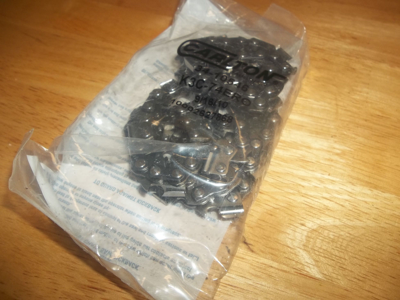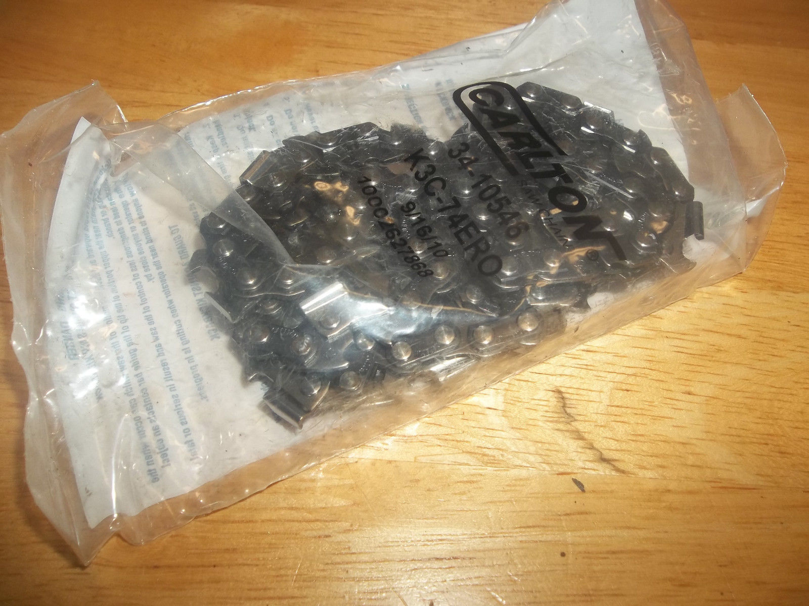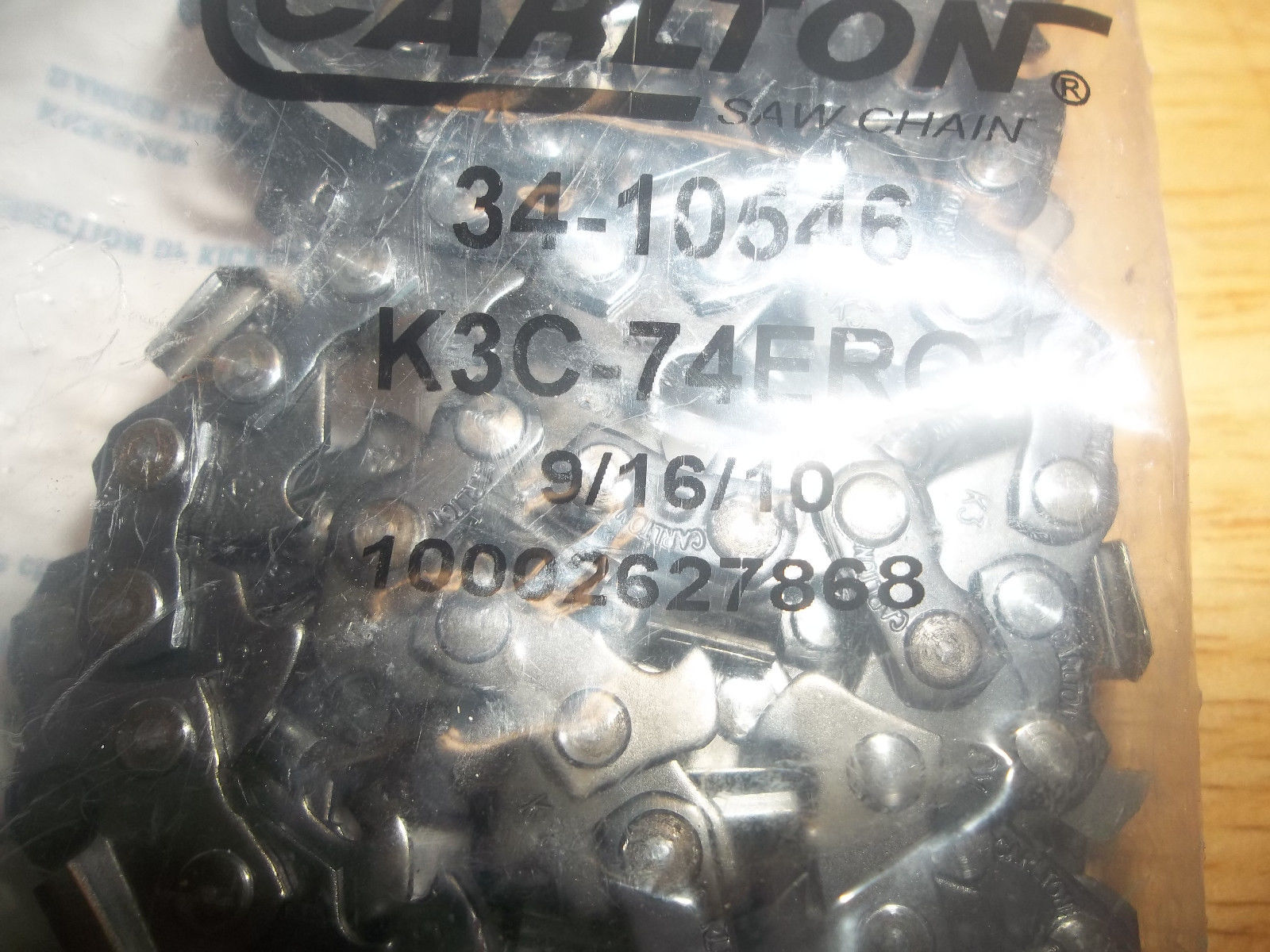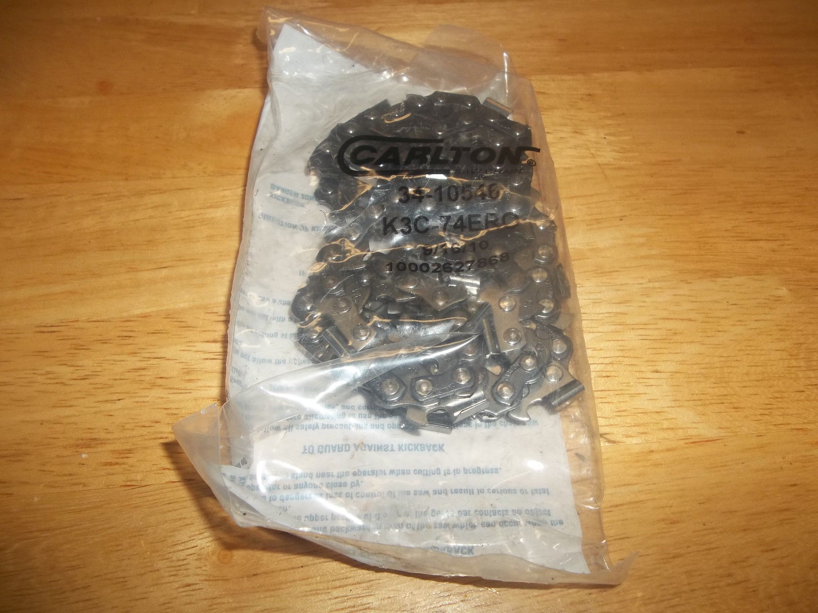 Here we have a NEW Old Stock Carlton K3C-74E RO 18″ Chainsaw Chain, .325 Pitch, .063 Gauge, 74 Drive Link. Fits Certain Models Stihl Chainsaws. Since all models of Chainsaws may come with any of a number of combinations of Bars and Chains, I make no claim of fitment to any particular saw model. What is important to know, is if your saw takes a .325 Pitch, .063 Gauge, 74 Drive Link Chain. 18″ Called Length. If it does, this chain should fit your saw. If you are unfamiliar with Pitch, Gauge, and Drive Link Count, get someone who is familiar with this to check your saw for this before purchase. This chain is New in the factory plastic bag, never opened. No Box. Please Look at the Pictures. What you see in the pictures are the exact item you will be receiving,nothing more, nothing less.