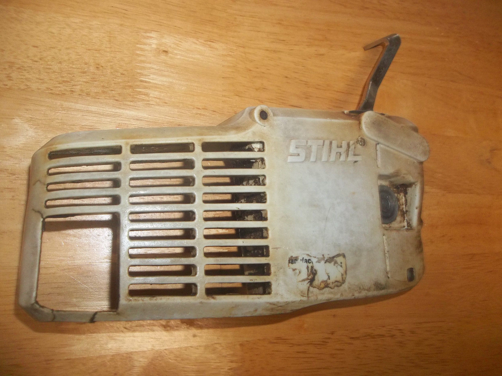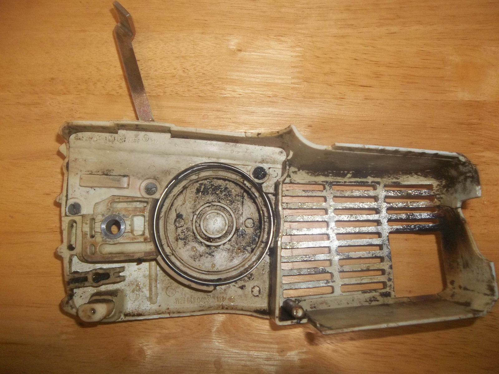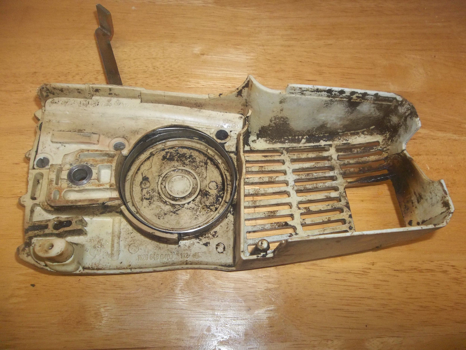 Here we have a USED OEM Stihl Chainbrake/Clutch Cover from a Stihl 009 Chainsaw, in good useable condition. Also should work on 010, 011, 012 as well. Brake band looks in good shape, the lever has some “play” in it, but the brake works. The housing is gray plastic. It is used, and from an older saw, so it does have scratches and some oily sawdust residue on the inside. Also, has some cracks around exhaust outlet area(see picture #7 for close-up).Please Look at the Pictures. What you see in the pictures is the exact item you will be receiving,nothing more, nothing less.