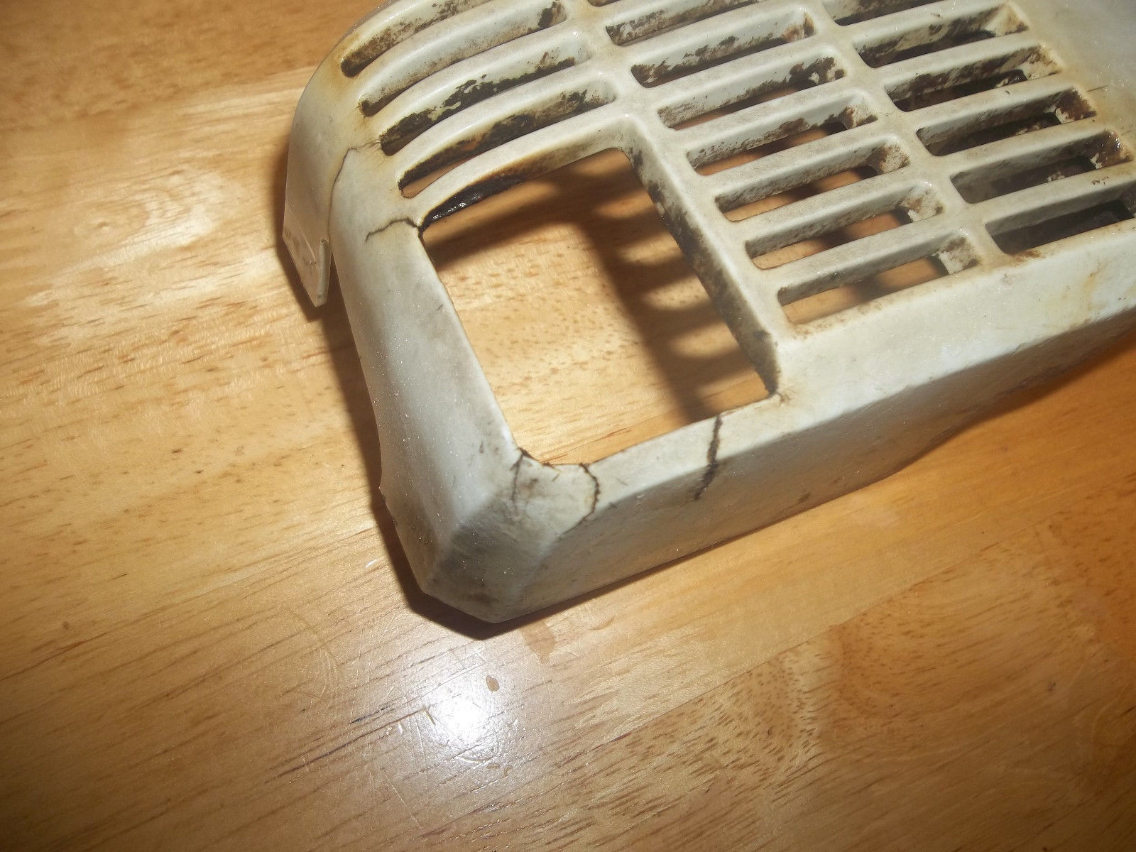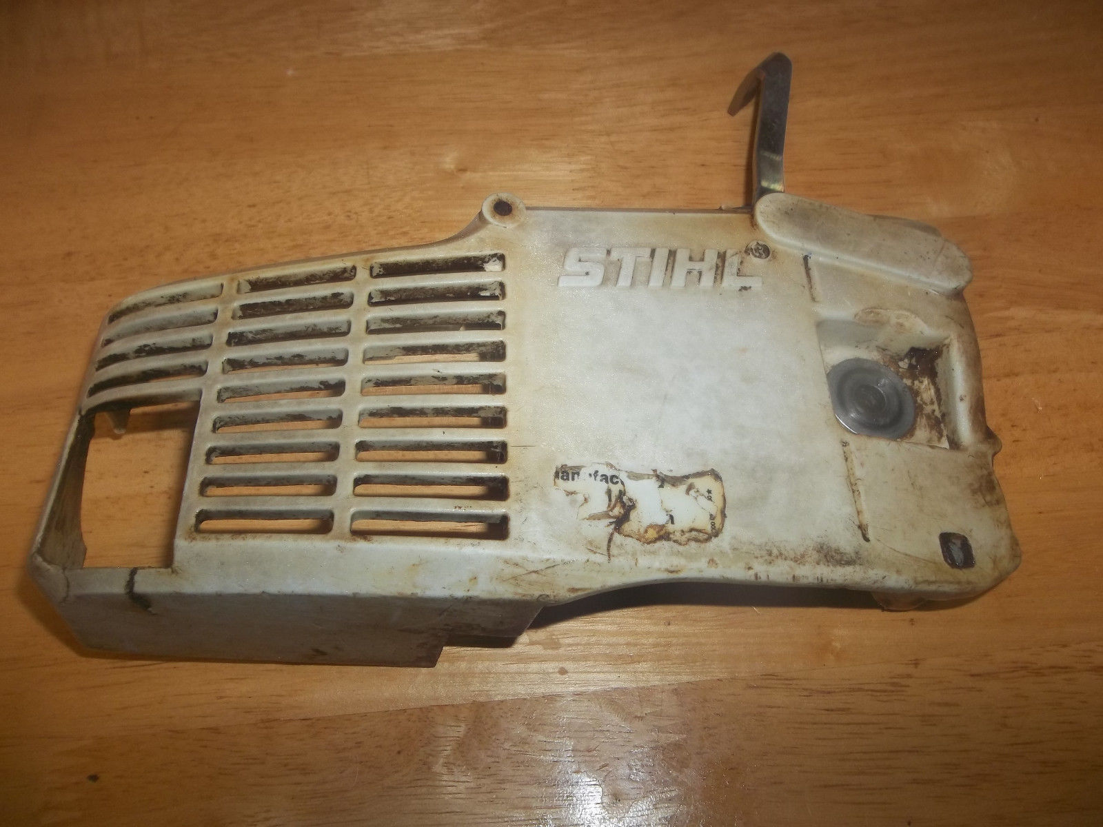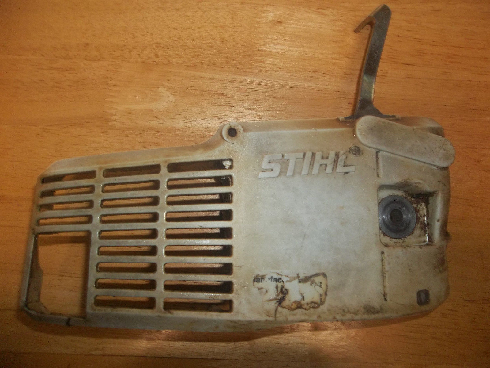 Here we have a USED OEM Stihl Chainbrake/Clutch Cover from a Stihl 009 Chainsaw, in good useable condition. Also should work on 010, 011, 012 as well. Brake band looks in good shape, the lever has some “play” in it, but the brake works. The housing is gray plastic. It is used, and from an older saw, so it does have scratches and some oily sawdust residue on the inside. Also, has some cracks around exhaust outlet area(see picture #7 for close-up).Please Look at the Pictures. What you see in the pictures is the exact item you will be receiving,nothing more, nothing less.