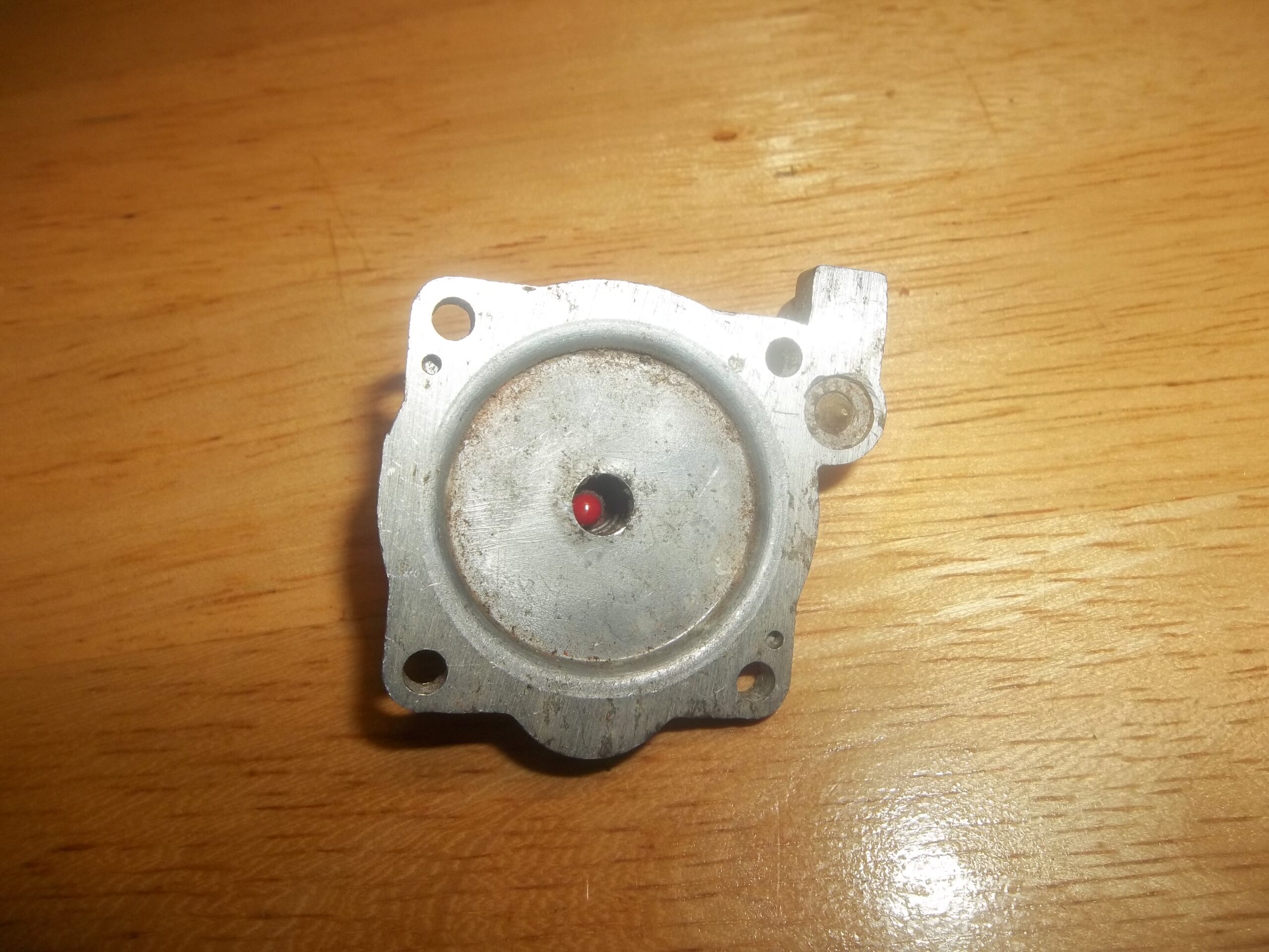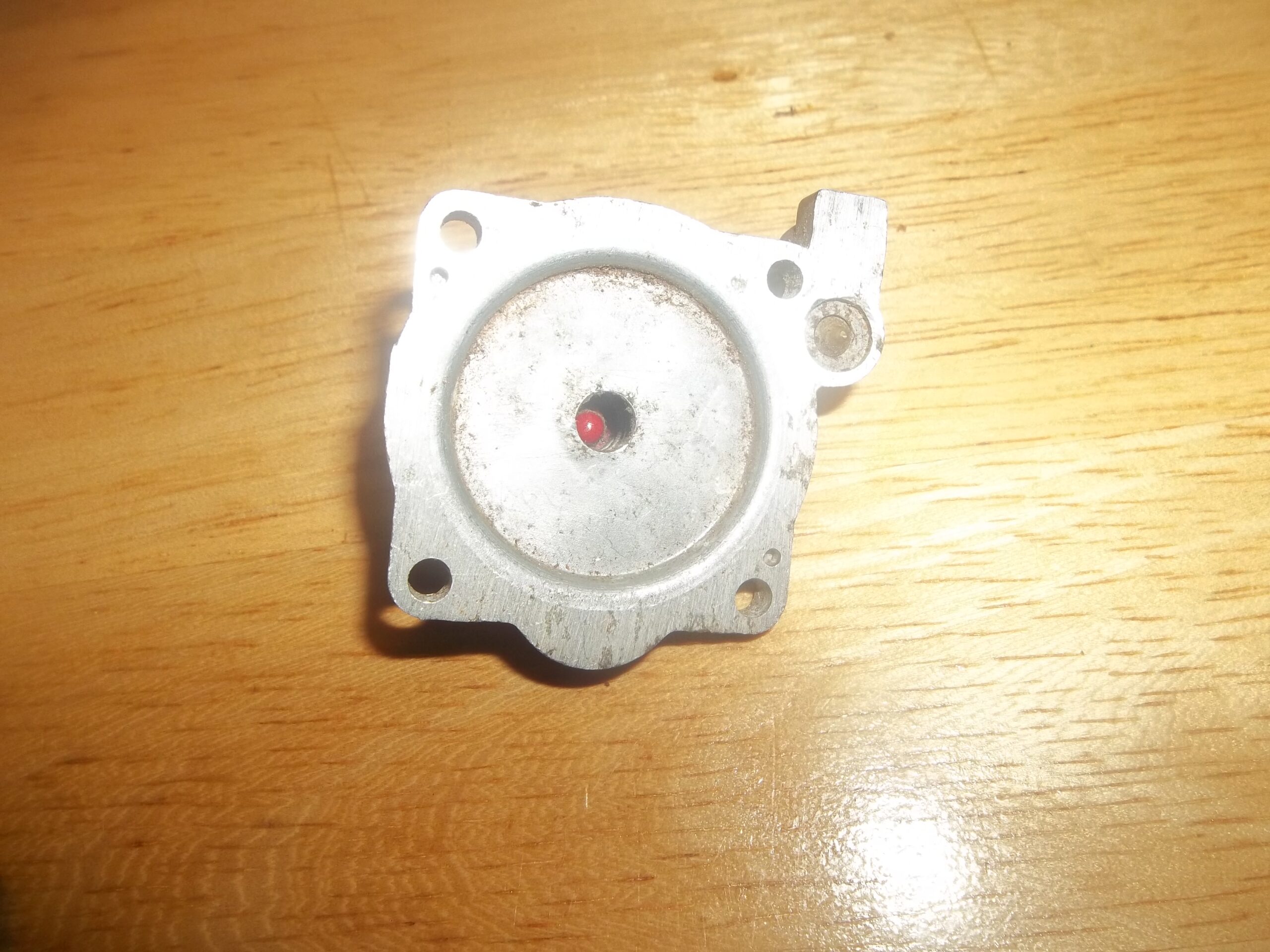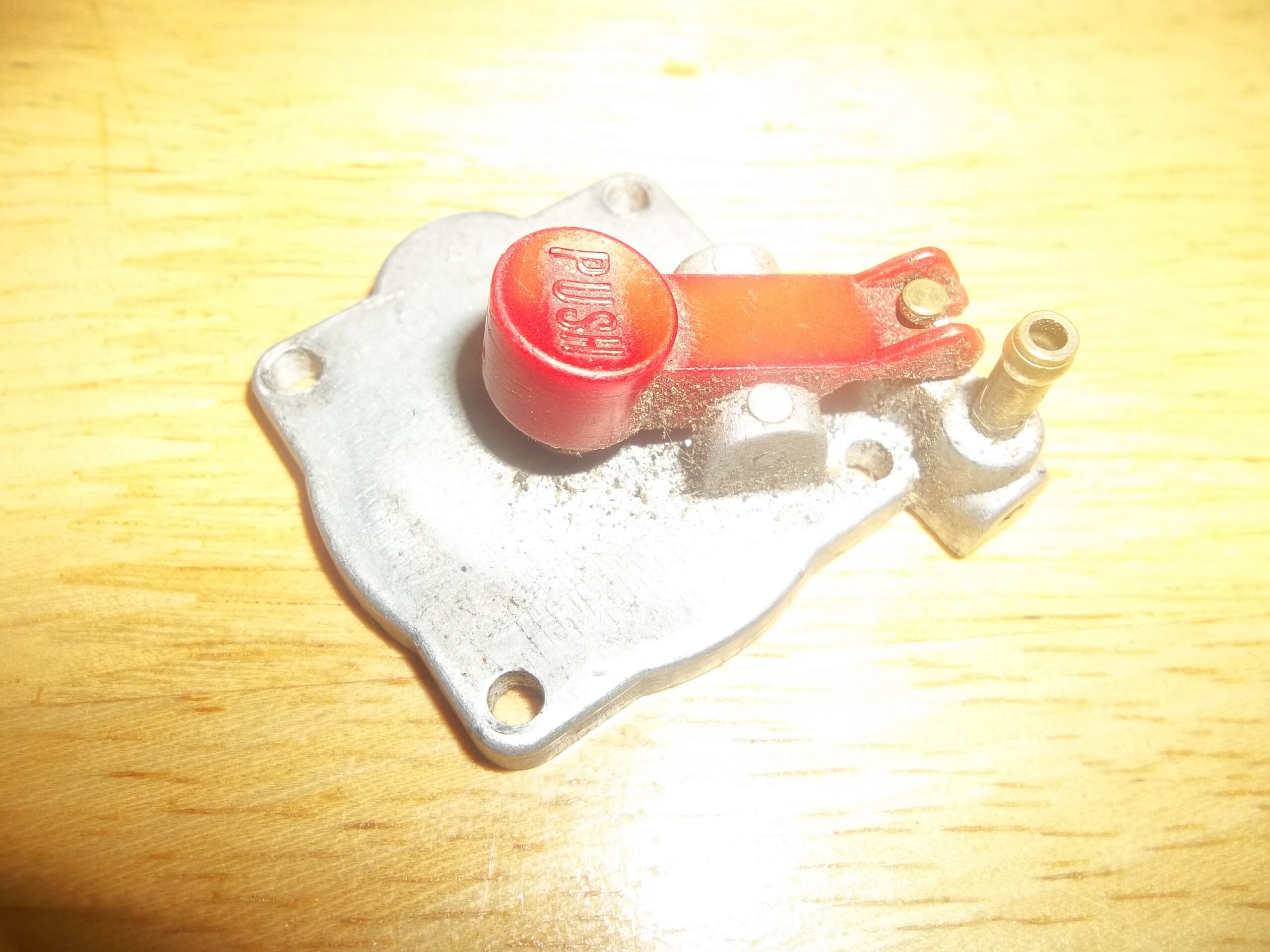 TK Carburetor bottom cover for Shindaiwa trimmer with red tickler button.